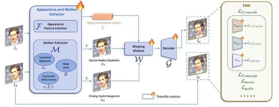 级联损失函数:LivePortrait采用了face vid2vid的多种损失函数,包括隐式关键点不变损失(LE)、关键点先验损失(LL)、头部姿态损失(LH)和变形先验损失(LΔ)。此外,还引入了级联感知损失(LP,cascade)和级联GAN损失(LG,cascade),进一步提升了纹理质量。同时,通过人脸身份损失(Lfaceid)保留了参考图片的身份特征。