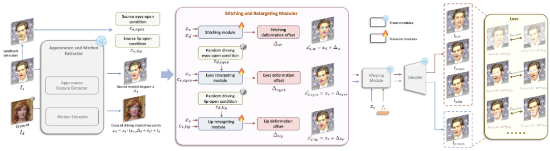 视频-图像混合训练:LivePortrait采取了创新的混合训练策略,将风格化人像图片视为单帧视频,并与真实人像视频一同训练。这种方法有效提升了模型对不同风格人像的泛化能力。