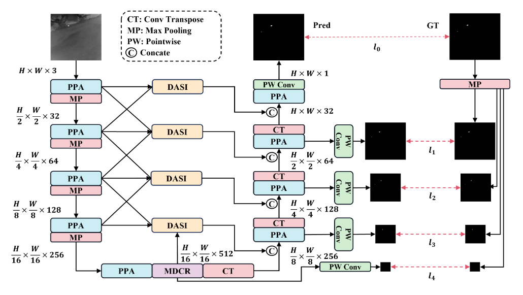 - Adaptive Feature Fusion:DASI模块增强了U-Net中的跳跃连接,专注于高低维特征的自适应选择和精细融合,以增强小目标的显著性 。