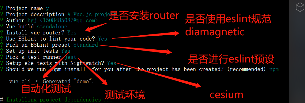 执行vue init webpack demo命令 后面是你需要创建项目的名字 webpack代表是使用webpack进行打包;
