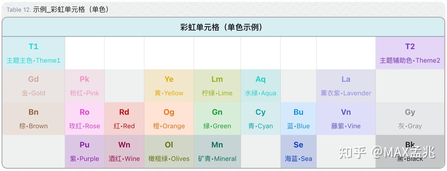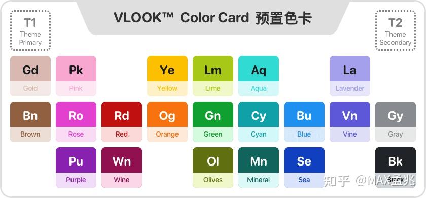 A:是 VLOOK 通过类似元素周期表简写的方式对常见颜色的代号,VLOOK 的预置色卡如下:
