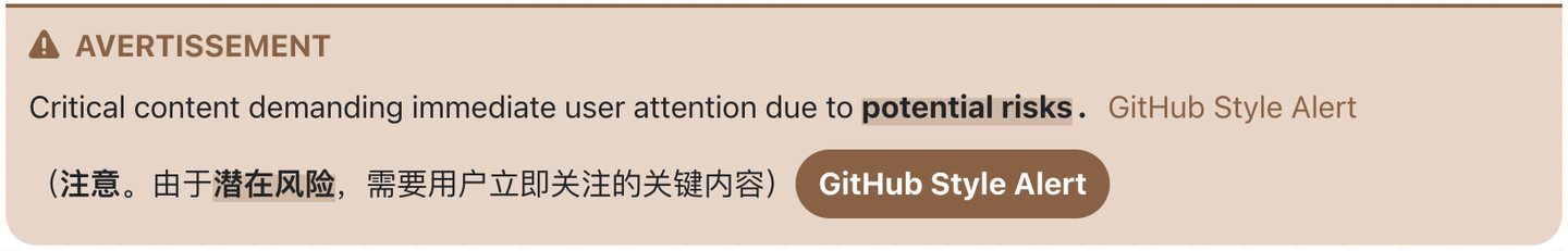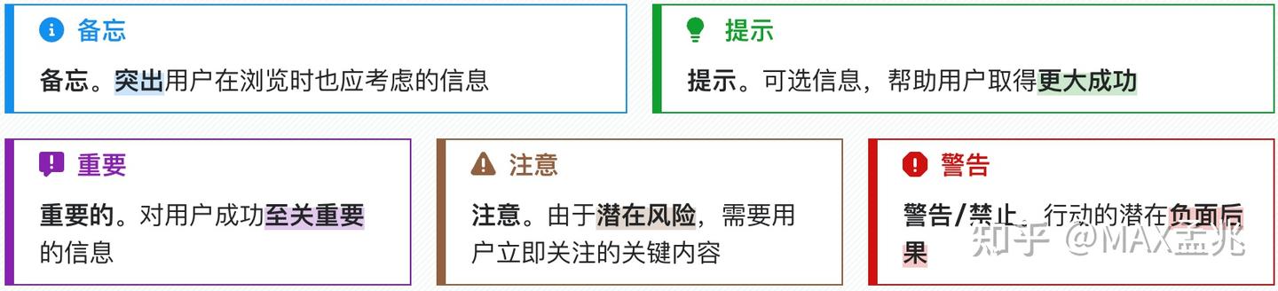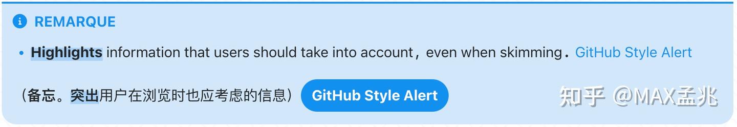「GitHub Style Alert」在文档中,主要用于在提示、备忘或强调关键的信息时使用的排版样式,由对应信息分类的图标、名称、内容等组成。