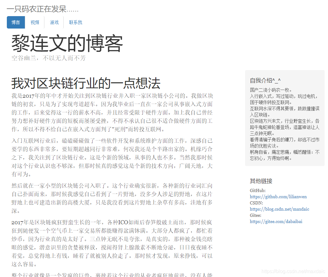 好不容易磨磨唧唧弄出一个可以看的网站界面,后来发现有个很大的问题:导航栏的按钮没法实现跳转。可能是我在前端方面练习得太少了,感觉自己很菜,测试了好几种方法都没搞定。更让我有点接受不了的是,里面的导航栏里的类型是nav-justified, 而这个类型在bootstrap文档里说明了是过时的。我也是醉了,过时了的东西还挂在最新的说明文档里推荐给大家使用。我是看这个导航栏好看才用的,现在功能上有些问题就只能放弃了。于是我用回了最原始的nav-pills类型的导航栏。