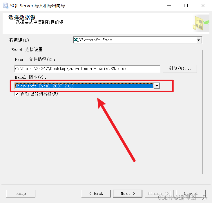 然后如果继续报错,我就服了,用07的竟然可以。这里SQL server是2018的,excel是2016的,但是在选择的时候必须默认??