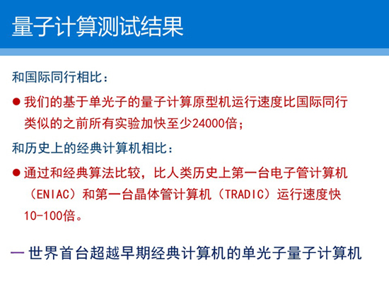 潘建伟团队的此次实验,使得中国的超导体系量子计算机研究,进入世界一流水平行列。首先,这次的光量子计算机原型机的取样速度比国际同行类似的实验加快至少24000倍;通过和经典算法比较,这也比人类历史上第一台电子管计算机和第一台晶体管计算机运行速度快10倍至100倍。