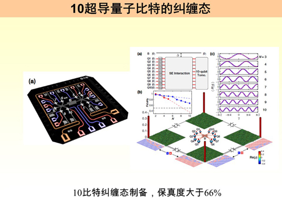 经过努力,潘建伟教授及其同事陆朝阳、朱晓波等,联合浙江大学王浩华教授研究组,把比特数目扩展到10个,并制备了10比特的纠缠GHZ态,保真度大于66%,据介绍,在目前公开的结果中,这是超导量子比特系统中纠缠的数目最多的。