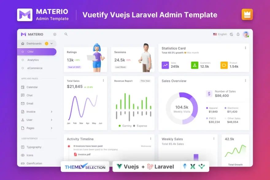 MaterioVuetify VueJS Laravel Admin Template –是开发人员最友好且高度可定制的管理仪表板模板,基于流行的前端框架VueJS和后端Laravel。