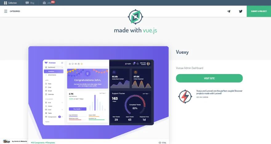 使用Vuejs制作是网站,管理模板,应用程序,实用程序,UI组件,库等的丰富集合;这是用VueJS制作的。你还将获得书籍,插件,图表等。