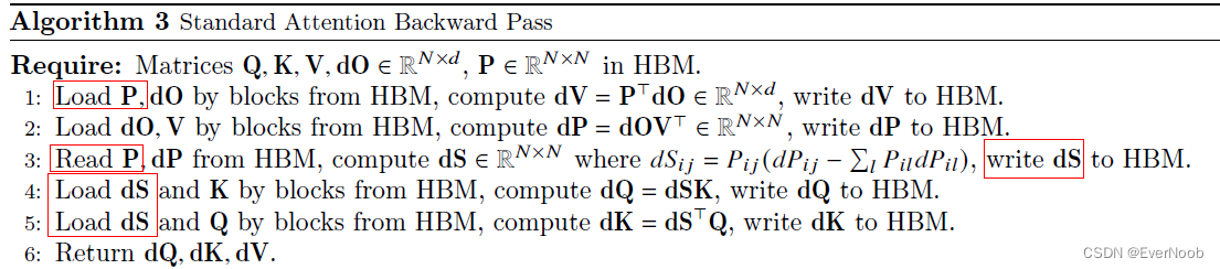 the backward pass for standard attention is listed below, with the avoidable memory costs boxed out: