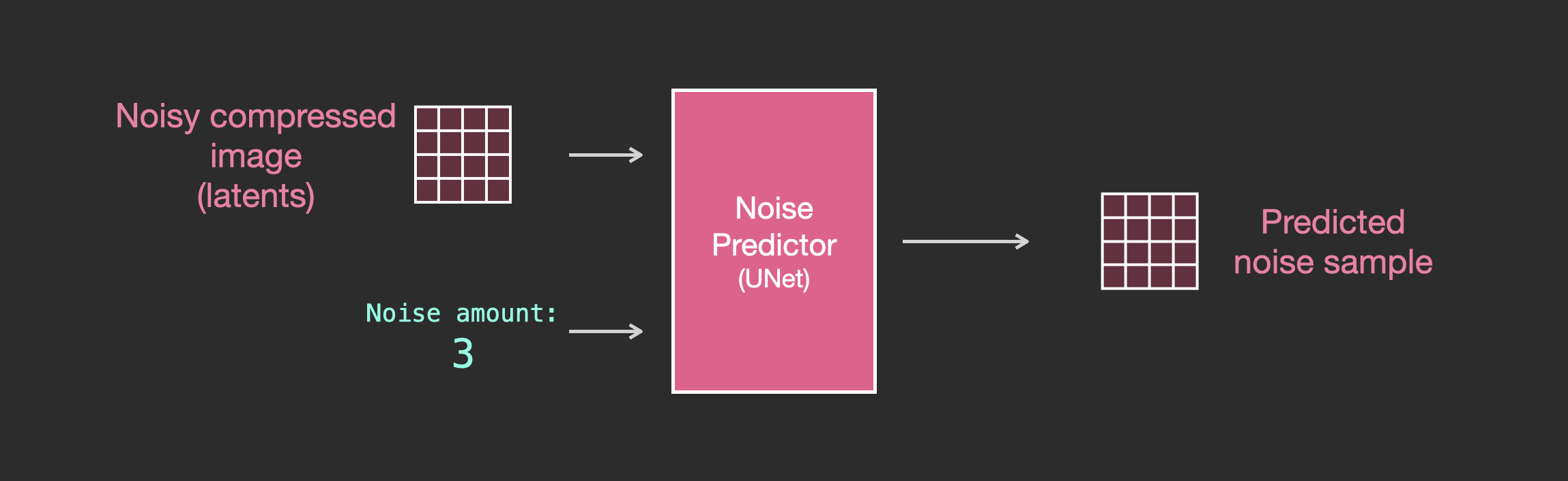 The trained noise predictor can take a noisy image, and the number of the denoising step, and is able to predict a slice of noise.
