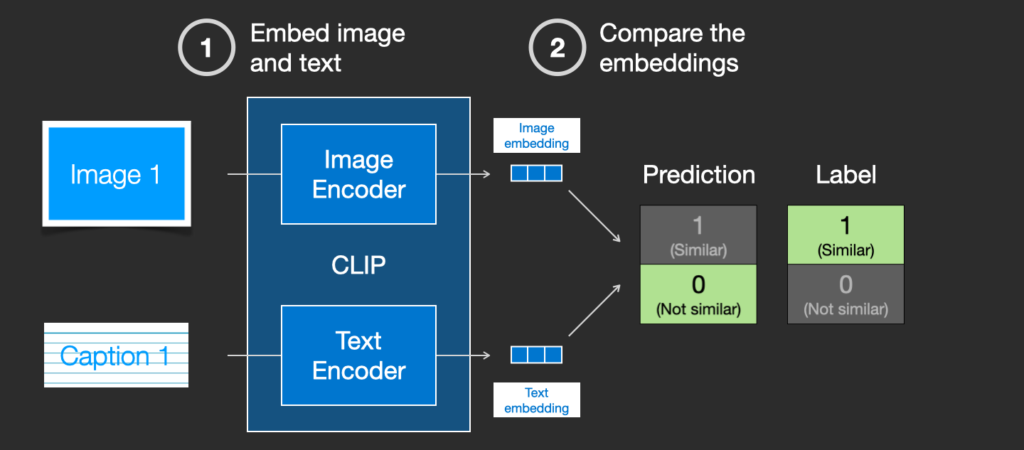 By repeating this across the dataset and with large batch sizes, we end up with the encoders being able to produce embeddings where an image of a dog and the sentence “a picture of a dog” are similar. Just like in word2vec, the training process also needs to include negative examples of images and captions that don’t match, and the model needs to assign them low similarity scores.