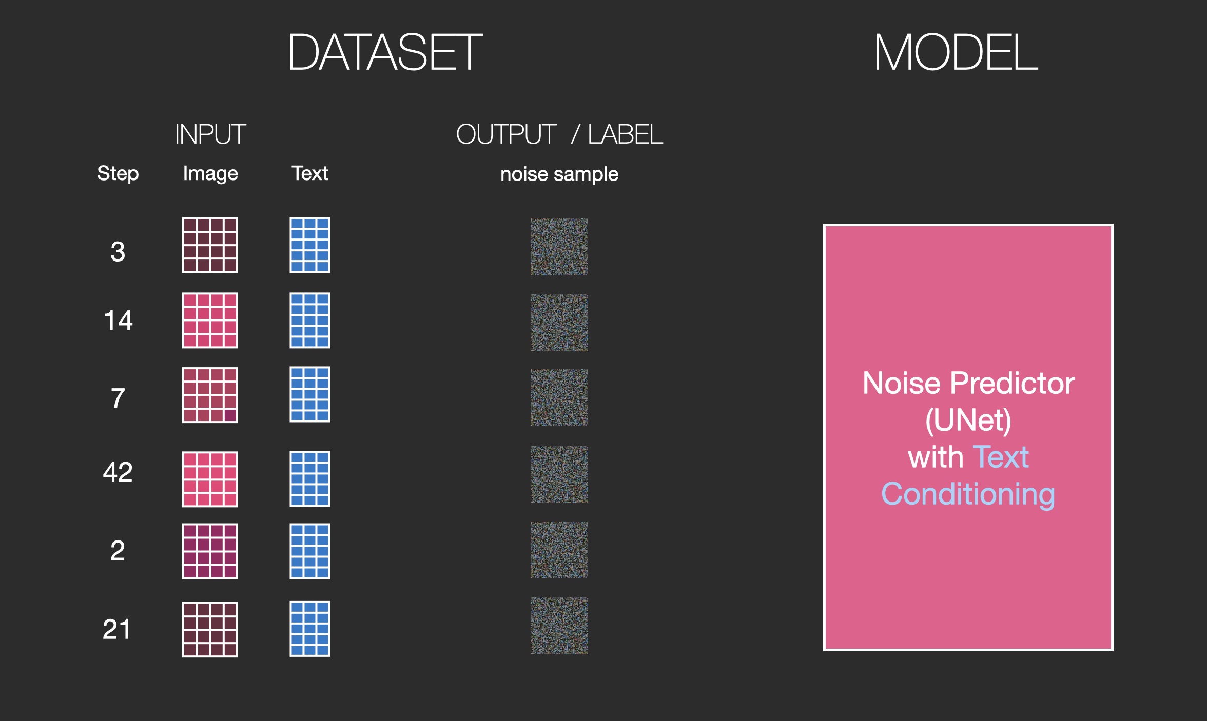Our dataset now includes the encoded text. Since we’re operating in the latent space, both the input images and predicted noise are in the latent space.