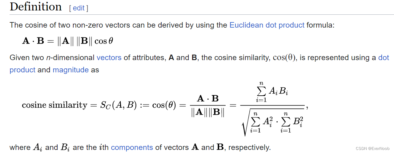 recall: cosine similarity measure the directional divergence between 2 vectors, i.e. it's just the cosine of the angle between vecA and vecB