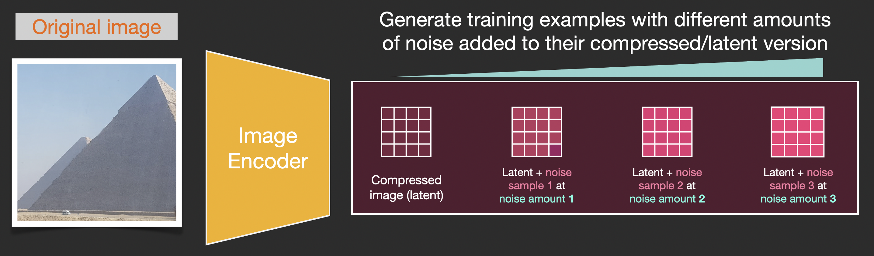 This can now be considered a training example. We can use this same formula to create lots of training examples to train the central component of our image generation model.