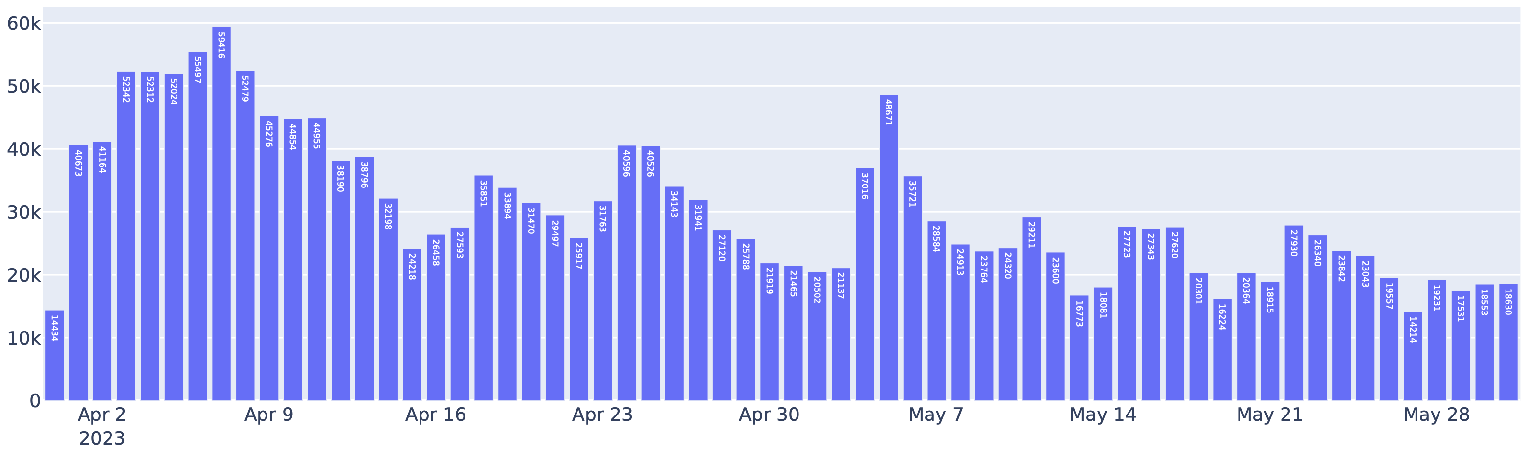 Requests served by FastChat-vLLM integration in the Chatbot Arena between April to May. Indeed, more than half of the requests to Chatbot Arena use vLLM as the inference backend.