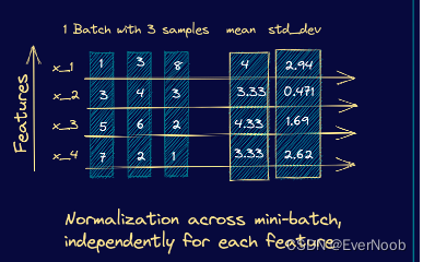 As an example, let’s consider a mini-batch with 3 input samples, each input vector being four features long. Here’s a simple illustration of how the mean and standard deviation are computed in this case. Once we compute the mean and standard deviation, we can subtract the mean and divide by the standard deviation.