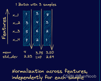 Here’s an example showing the computation of the mean and variance for layer normalization. We consider the example of a mini-batch containing three input samples, each with four features.