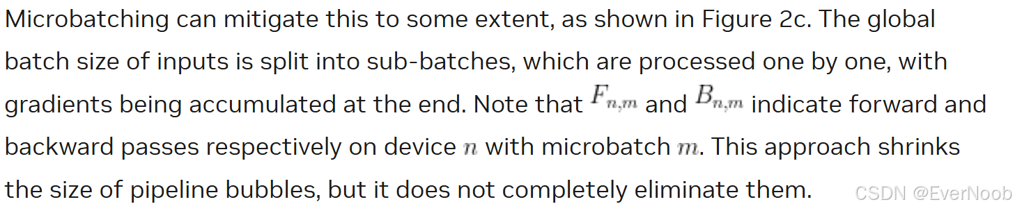 Note that data parallelism is also a technique often mentioned in the same context as the others listed below. In this, weights of the model are copied over multiple devices, and the (global) batch size of inputs is sharded across each of the devices into microbatches. It reduces the overall execution time by processing larger batches. However, it is a training time optimization that is less relevant during inference. ==> largely due to lack of sufficiently large batch size during inference time in the first place