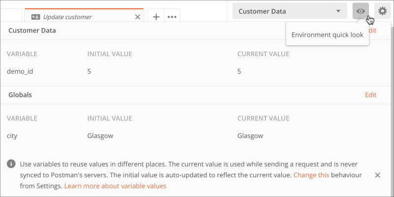 Postman 允许用户在发送和接收时使用变量,以提高工作效率和可读性(不过只能保存字符串类型的值,所以复杂数据类型需要借助于 JSON.stringify() 和 JSON.parse() 来管理)。