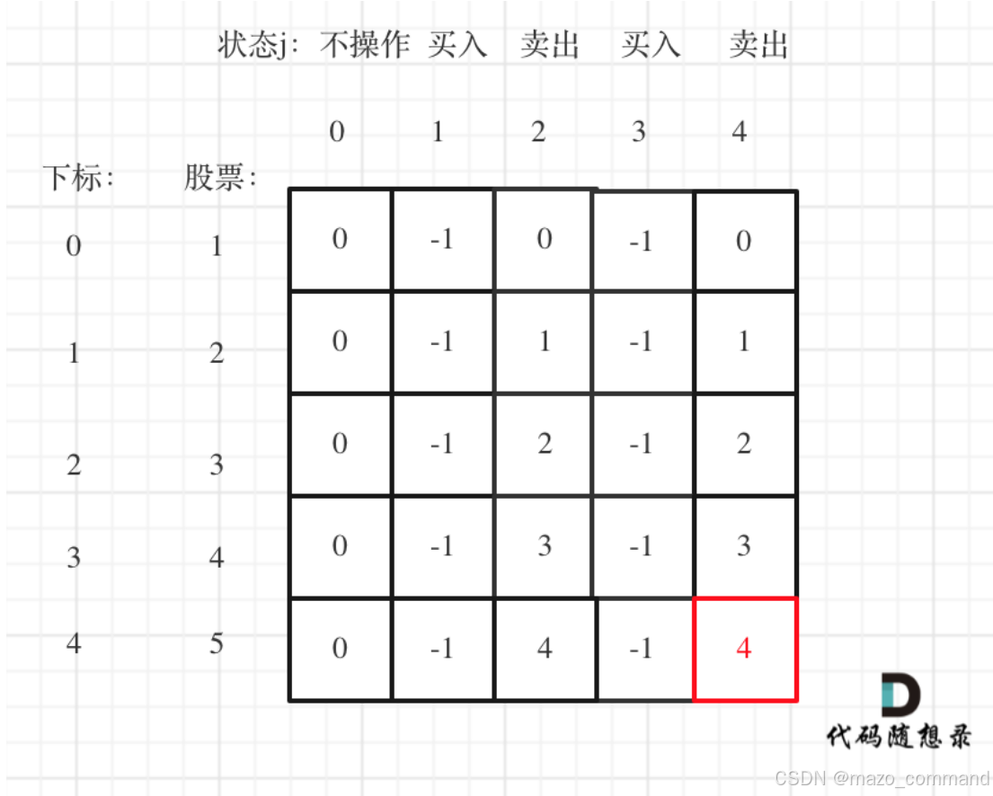 dp[i][0]=max(dp[i-1][0],dp[i-1][1]-prices[i],dp[i-1][3]-prices[i]);