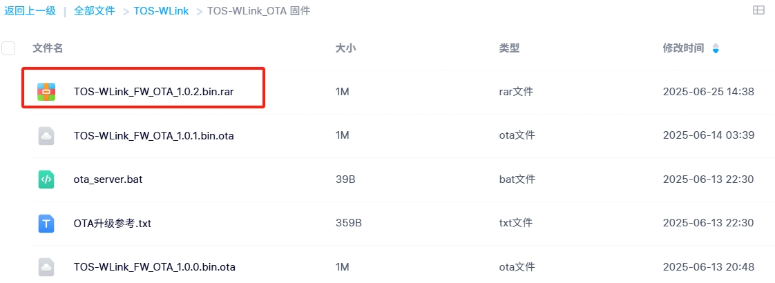 固件1.0.2已经上传到百度网盘TOS-WLink OTA固件目录: