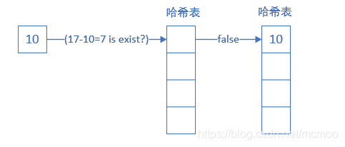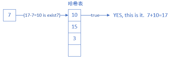 更加形象的描述:遍历数组[10、15、3、7],判断(给定数字17-当前值10)的值:7,是否存在哈希表map里,如果7不存在map里,我们就把10放进map里,此时map:{10},然后继续遍历数组,遍历到了7,此时map:{10,15,3},我们再用17-7=10,判断10是否在哈希表map里,当然是在了!