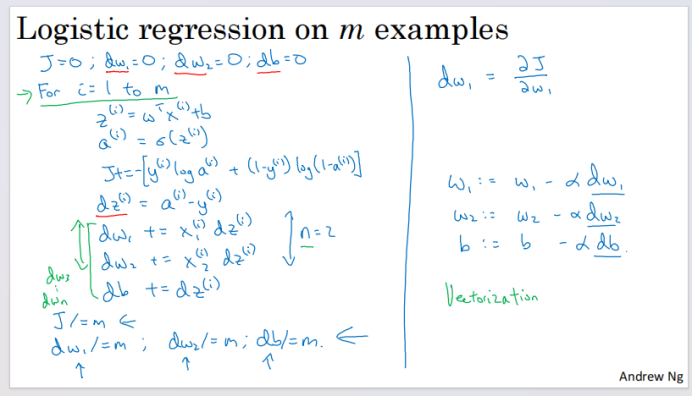 循环1:样本从1到m;循环2:x,w是多维的,要循环计算每一行的值,才能得到向量