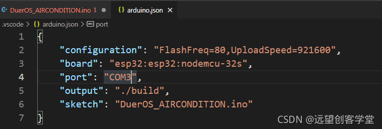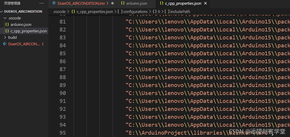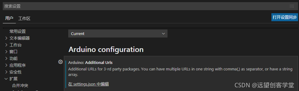 Vscode下设置:文件->首选项->设置->扩展->Arduino configuration,打开settings.json