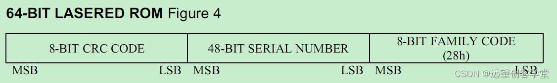 每只DS18b20都有一个唯一的长达64位的只读存储器,存放在ROM中,低8位是ds18b20的单总线温度传感器,高8位是CRC循环冗余校验码,用以校正前56位是否正常,中间48位是一个唯一序列号,此64位只读寄存器常用于元器件的识别和匹配。
