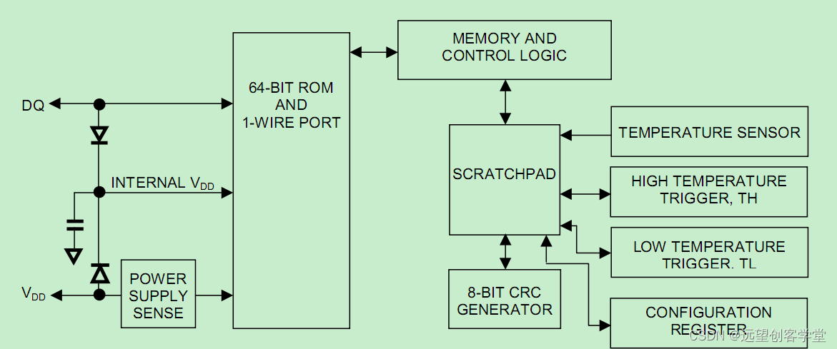 DS18b20内部结构主要由四部分组成: 64位光刻ROM、温度传感器、非挥发的温度报警传感器TH和TL、配置寄存器。
