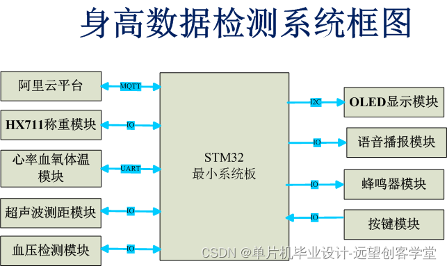 本课题设计是基于STM32单片机作为控制主体,通过HX711称重模块,HC-SR04超声波测距模块,红外测温,心率传感器等模块通过I2C或SPI接口与STM32进行通信,并读取传感器输出的身高,体重,心率,体温,血氧,心率,体脂率数据等数据,体脂率采用公式计算,可自行设置阈值超出阈值蜂鸣器发出警告。检测完身体的相关数据后,使用Wi-Fi方式将采集的数据发送到主机设备。而主机设备使用相关软件来接收和显示数据,平台生成历史数据曲线,方便用户直观查看,让用户能够方便地进行数据浏览。