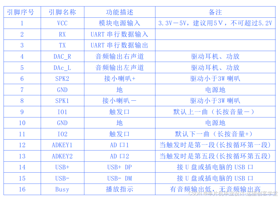 - 存储技术:DFPlayer Mini支持播放来自SD卡或U盘上的音频文件,支持MP3、WAV等多种格式。