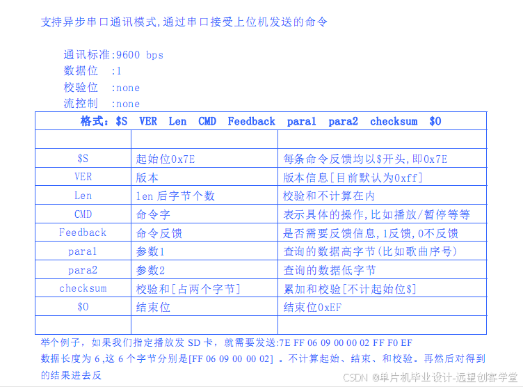 - 控制技术:采用串行通讯方式(TTL UART),可通过单片机的IO口控制DFPlayer Mini的操作,如选择歌曲、暂停/播放、调节音量等。