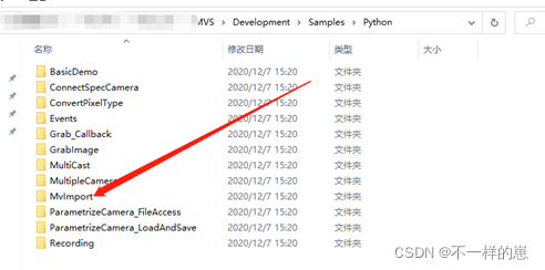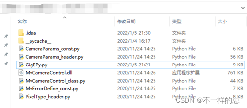 将案例中的MVImport单独拷出到新的文件夹,新建一个主程序文件GigEPy.py,其余的均为MVImport拷出的import程序,还有主要把MvCameraControl.dll拷进去,一般在C:\Program Files (x86)\Common Files\MVS\Runtime\Win64_x64这个路径里