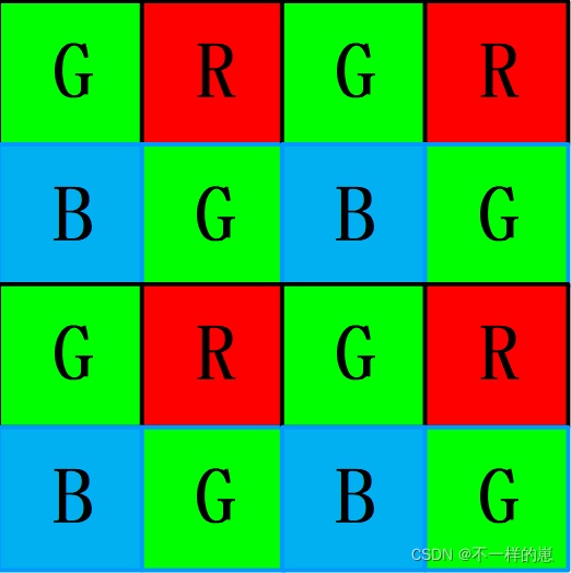 对于彩色图像的采集,最简单的方法就是对于每一个像素点用红绿蓝三种滤镜进行三个值的信号采集。但是传感器中单独的一个感光点只能接收感光信号,无法区分出感光信号种类。而用bayer阵列解决了这个问题,bayer阵列每个感光点只用一种颜色的滤镜。由于人眼对绿色较为敏感,所以整个传感器的感光点中采集绿色通道的感光点是其他两个通道的两倍,bayer的色彩滤波阵列G占1/2,R和B各占1/4。如下图所示