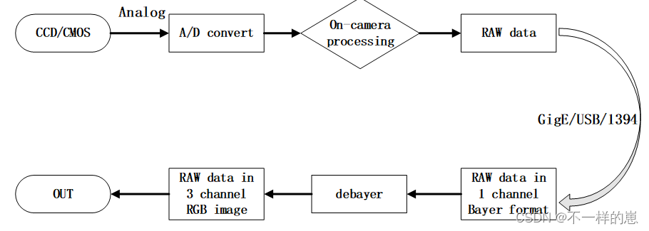 如下流程图所示,相机从CCD/CMOS获取模拟信号,经数模转换后,得到了原始的数字信号,由于需要考虑到原始数据的大小以及传输带宽,需要进行相机内部的预处理,对原始信号进行压缩,得到了RAW格式的原始图像数据。RAW为单通道size为Wight*Height的Bayer数据,需要通过debayer(解拜尔算法)转换成具有三通道的RGB图像。