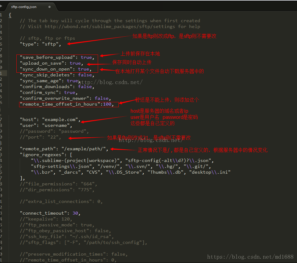 自动生成一个sftp-config.json文件,根据下图设置,红色箭头指向的是必须要自己重新设置的