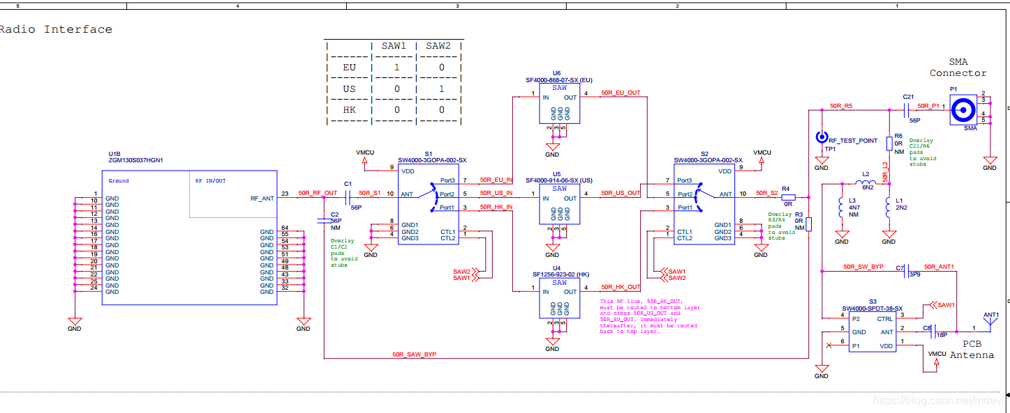 SAW filter 无非就是E, U, H 三个频段 , 官方提供通过IO口选择不同的SAW filter: SAW1 SAW2对应的是芯片的IO口,具体查看 BRD420xBoardInit(RadioConfig.eRegion); 默认的IO PB14, PB15