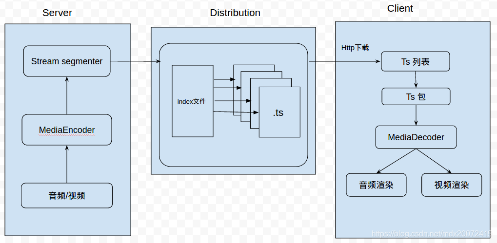 我们首先将要直播的视频送到编码器中,编码器分别对视频和音频进行编码,然后输出到一个MPEG-2格式的传输流中,再由分段器将MPEG-2传输流进行分段,产生一系列等间隔的媒体片段,这些媒体片段一般很小并且保存成后缀为.ts的文件,同时生成一个指向这些媒体文件的索引文件,也就是我们很经常听到的.M3U8文件。完成分段之后将这些索引文件以及媒体文件上传到Web服务器上。客户端读取索引文件,然后按顺序请求下载索引文件中列出的媒体文件。下载后是一个ts文件。需要进行解压获得对应的媒体数据并解码后进行播放。由于在直播过程中服务器端会不断地将最新的直播数据生成新的小文件,并上传所以只要客户端不断地按顺序下载并播放从服务器获取到的文件,从整个过程上看就相当于实现了直播。而且由于分段文件的很短,客户端可以根据实际的带宽情况切换到不同码率的直播源,从而实现多码率的适配的目的。