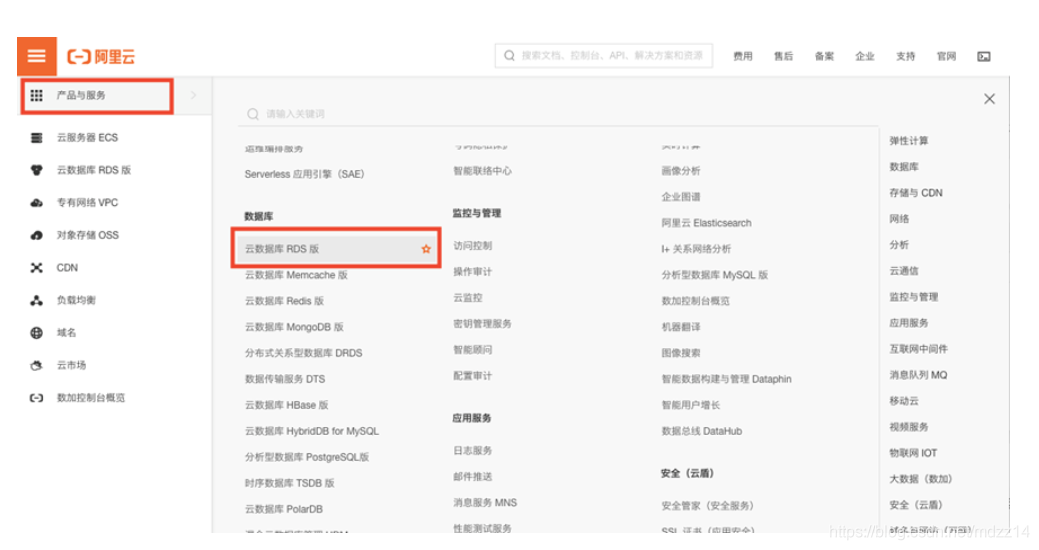 登录控制台后在数据库中选择 云数据库RDS版 ,进入阿里云RDS管理控制台。