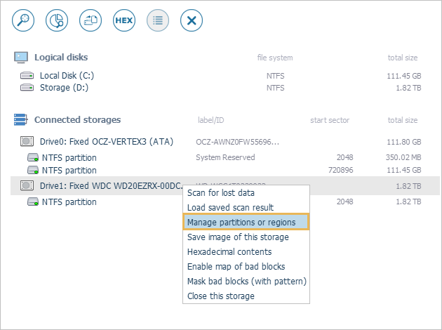 - 在其右键菜单中选择“管理分区或区域”选项;