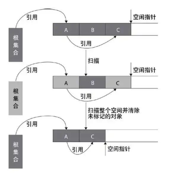 标记-整理算法采用标记-清除算法一样的方式进行对象的标记,但在清除时不同,在回收不存活的对象占用的空间后,会将所有的存活对象往左端空闲空间移动,并更新对应的指针。