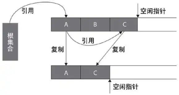 该算法的提出是为了克服句柄的开销和解决堆碎片的垃圾回收。它开始时把堆分成 一个对象 面和多个空闲面, 程序从对象面为对象分配空间,当对象满了,基于copying算法的垃圾 收集就从根集中扫描活动对象,并将每个 活动对象复制到空闲面(使得活动对象所占的内存之间没有空闲洞),这样空闲面变成了对象面,原来的对象面变成了空闲面,程序会在新的对象面中分配内存。