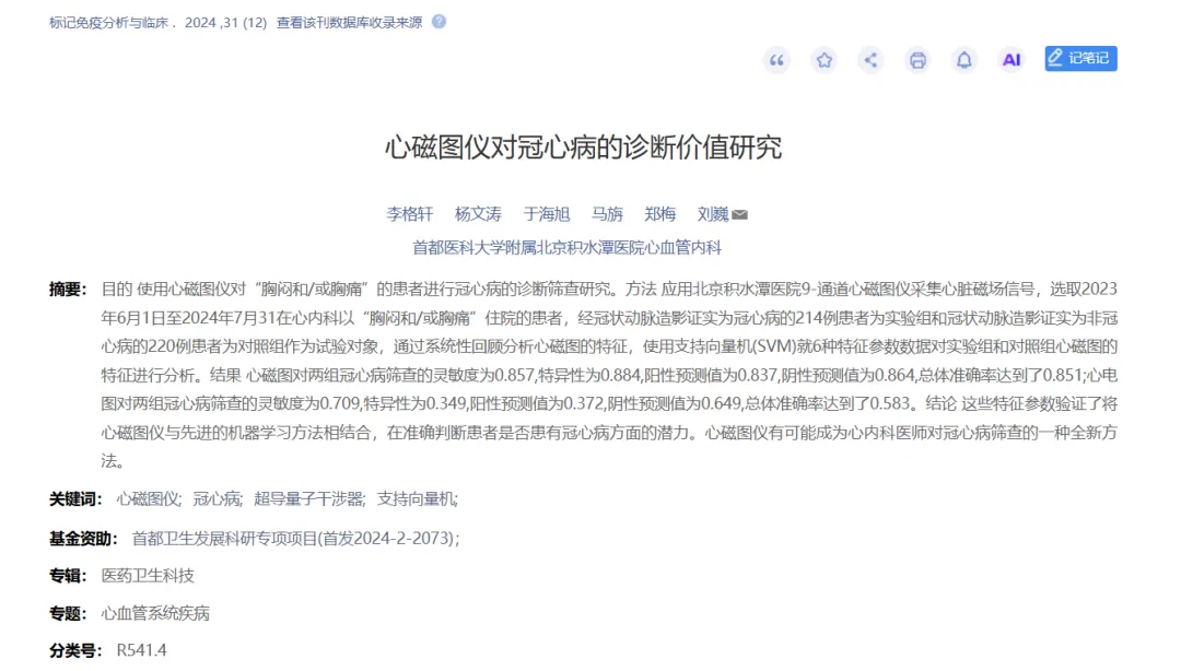 1.李格轩《心磁图仪对冠心病的诊断价值研究》-标记免疫分析与临床 . 2024 ,31 (12)