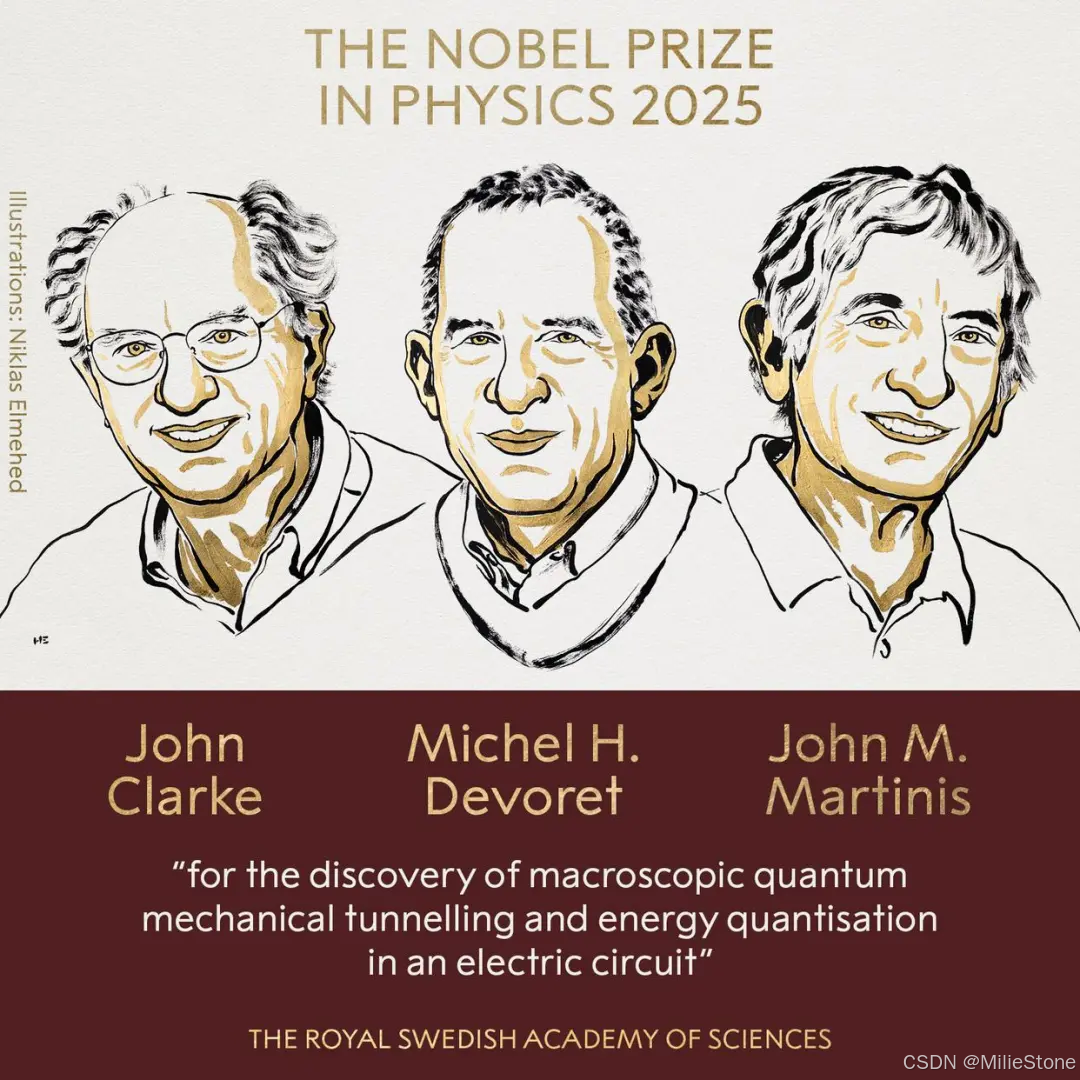 2025年10月7日,瑞典皇家科学院官宣:2025 年诺贝尔物理学奖授予约翰・克拉克(John Clarke)、米歇尔・H・德沃雷(Michel H. Devoret)和约翰・M・马丁尼斯(John M. Martinis),以表彰他们 “ 发现宏观量子力学隧穿和电路中的能量量子化 ”。