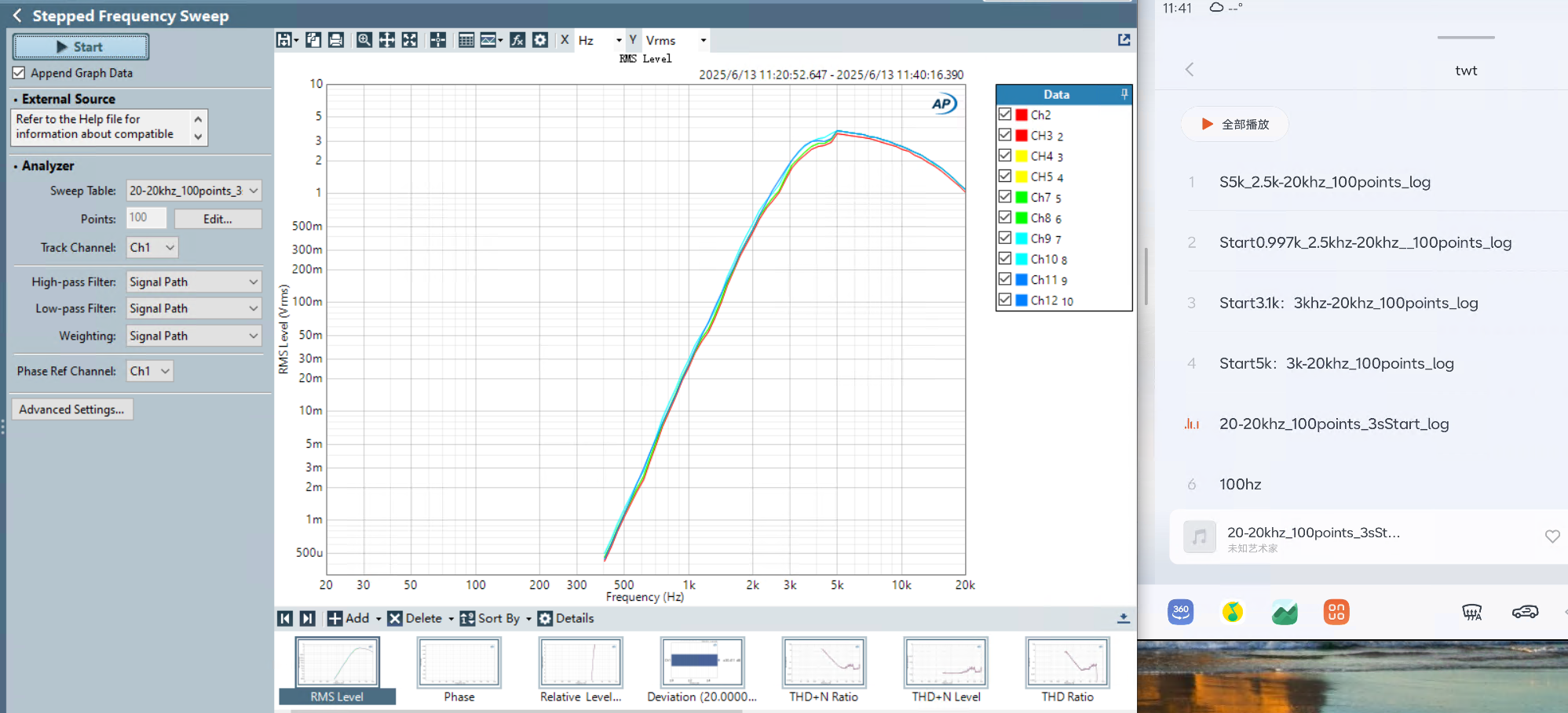 选中RMS Level图表,先点击Start,开始“Stepped Frequency Sweep”,然后在车机端播放刚刚生成的扫频信号