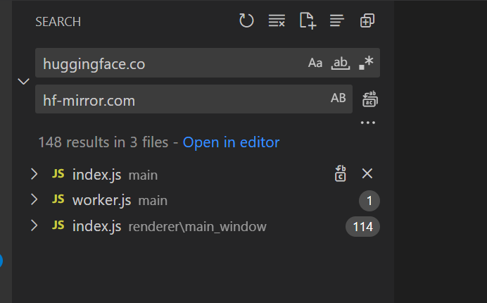 1、右键打开应用文件所在位置 2、依次进入目录 app-0.3.5\resources\app\.webpack 3、通过vs-code 打开该目录 4、搜索替换 huggingface.co -> hf-mirror.com 5、重新打开lm-studio就可以了