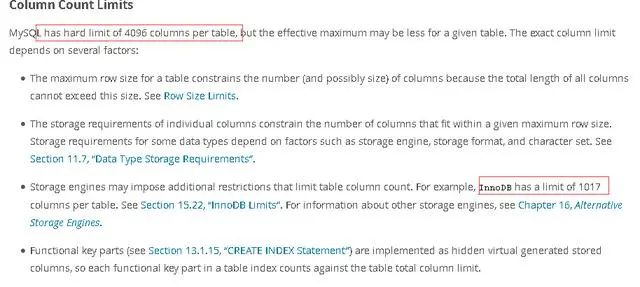 因此,官方文档中介绍的MySQL innodb引擎表最多有1017个字段。