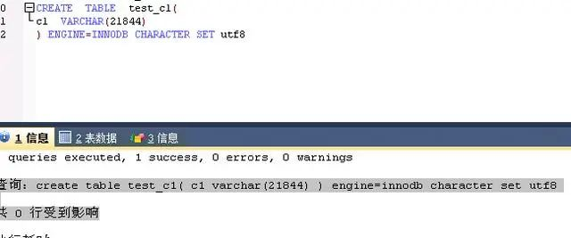 查询:create table test_c1( c1 varchar(21844) ) engine=innodb character set utf8