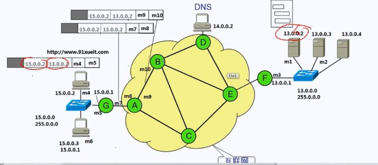 以下图所示:蓝色为交换机,右边为服务器,左边为客户计算机,m开头表示mac地址,15.0.0.2表示ip地址。在数据传输的过程当中间,ip地址决定了数据包最终到哪里去,mac地址决定数据在路由器中怎么走。